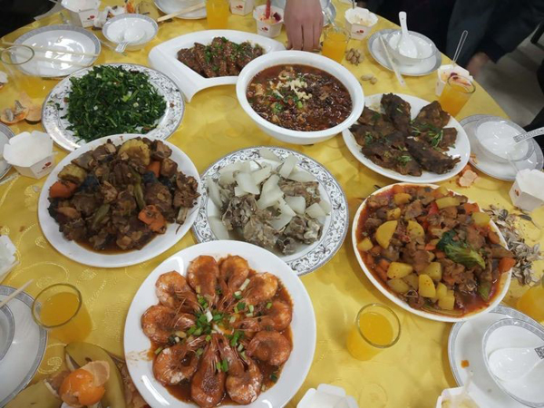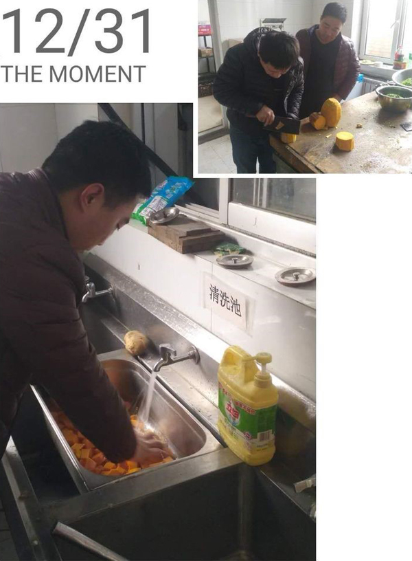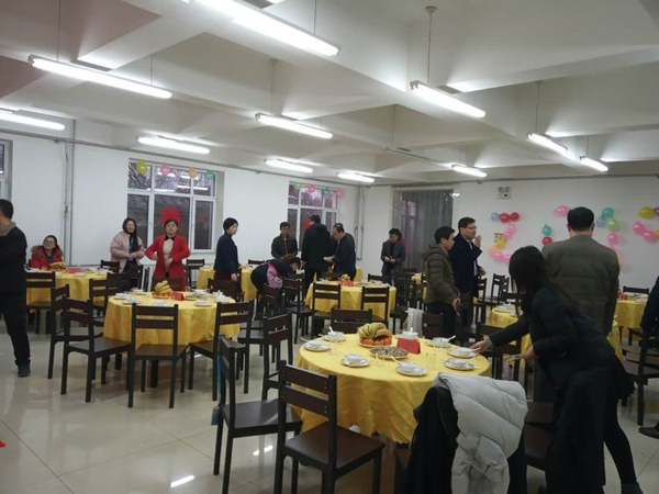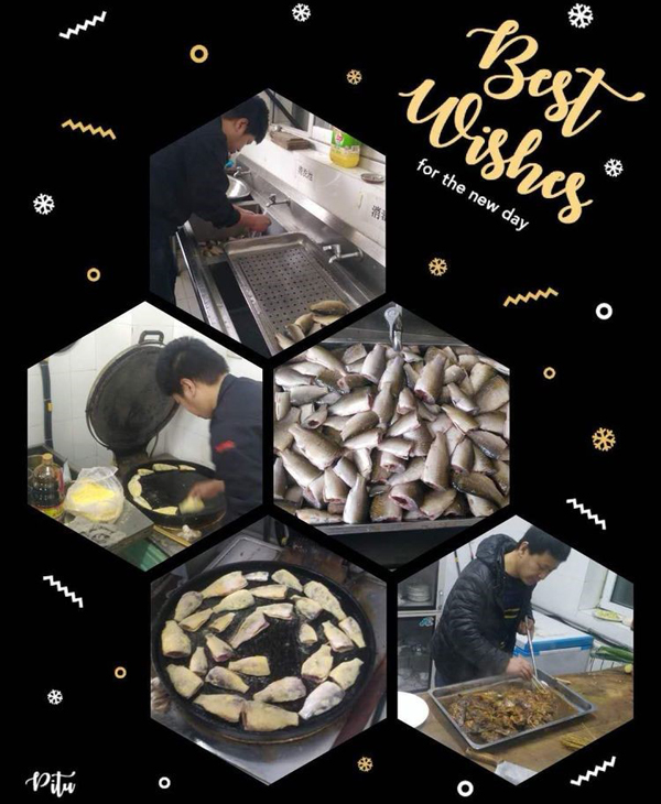 大家伙共同布置我們的會(huì)場(chǎng),貼福字,掛條幅,換桌布,有些同事自己從家里拿案板與廚具。四星也是我們的家。